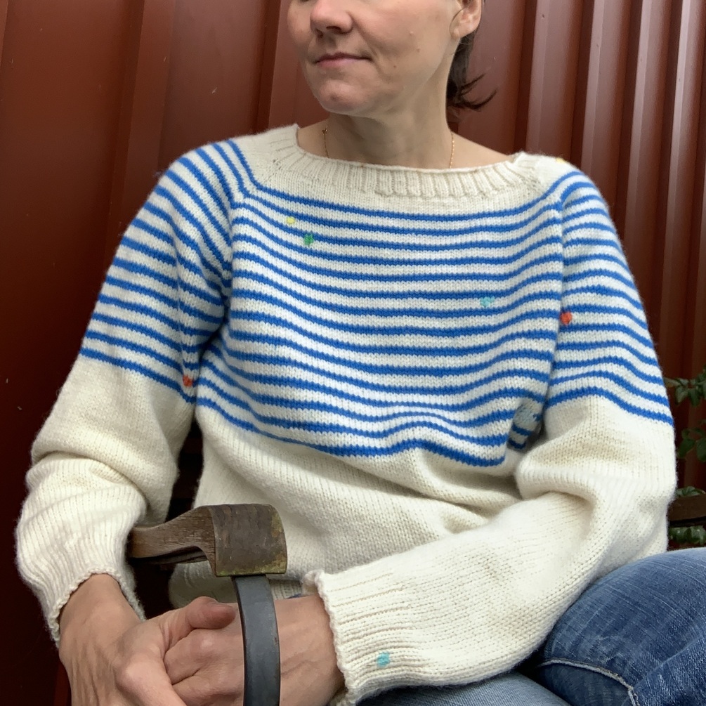 The Painter was inspired by a famous photograph of Picasso wearing a simple, striped breton shirt. The tiny “paint splashes” are duplicate stitch embroidery to add some colourful details to the classic design.
